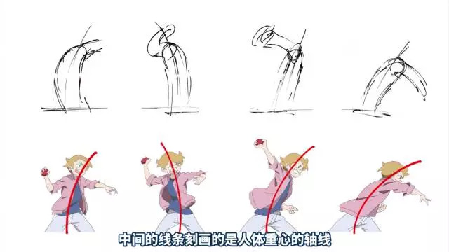 他画出了抛掷物体时,人体运动时的重心轴线。一开始轴线会稍微向前,准备扔出时,轴线会稍稍回弹。
